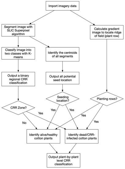 Figure 6 is the flowchart of the PBP classification algorithm. The SLIC Superpixel algorithm was first applied to a CIR image, and a number (k) of superpixel “seeds” were then generated and distributed uniformly across the image. The imported image was then divided into superpixels (small, rather homogenous, areas in the image) based on spectral and shape information around each “seed.” The mean of the DN values within each superpixel was calculated and assigned to the superpixel so that it had a single DN value. The number (k) of superpixels was user-determined and provided to the algorithm based on the field planting rate; i.e., the number of superpixels was expected to be similar to the number of cotton plants in the image, multiplied by a scaling factor to account for bare soil areas in the image. K-means clustering was applied to the superpixel image to achieve a two-class regional classification, with “1” and “0” to represent CRR and healthy zones, respectively. At the same time, planting rows were detected by calculating the gradient of the raw image. A binary plant row image was generated, with “0” and “1” representing plant rows and the gaps between them, respectively. The centroids of each superpixel were identified and marked as potential cotton plant centroids, with “1” and “0” representing cotton plant and bare soil, respectively. The centroids of superpixels located in the CRR zone (as determined by k-means) and the planting row were regarded as locations of CRR-infected plants. The centroids of superpixels located in healthy zones and within the planting row were regarded as locations of healthy plants.