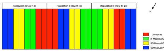Figure 8) of 100 ft (30.48 m) in length, with an adjacent pair of rows receiving a treatment, and three replications per treatment, arranged in a randomized complete block design. For the two continuous-spray treatments, Topguard Terra was applied at 0.675 g active ingredient in 216 mL per 30.5 m (100 ft) of row length. This rate is equivalent to the labeled application rate of 237 mL (8 fluid oz.) formulation in 37.9 L (10 gal.) of water applied to 0.405 ha (1.0 ac.).