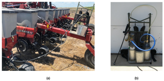 Figure 9b) with a pressure of 241 kPa (35.0 psi). Plots were planted and the in-furrow treatment was applied at planting on May 10, 2018. The soil temperature was 34 °C (94 °F).