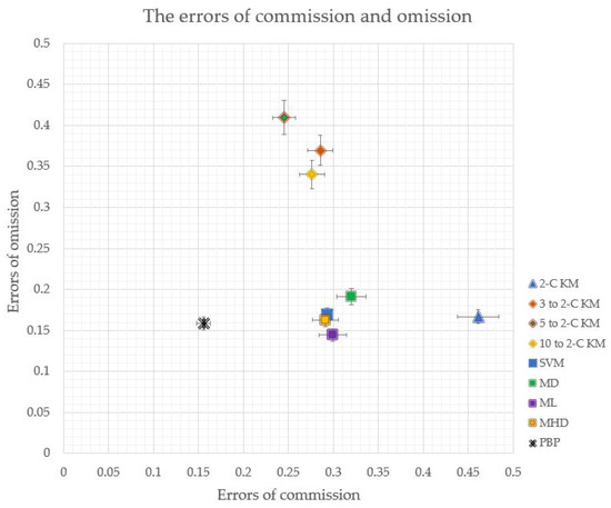 Figure 7). The errors of commission, representing a measure of false-positives, and errors of omission, representing a measure of false-negatives, were also calculated to evaluate the classifiers. Regional classification methods including k-means, SVM, MD, ML, and MHD were compared to the PBP classification method based on overall classification accuracy, the kappa coefficient, and errors of commission and omission.