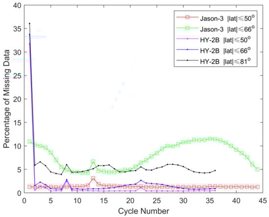 In addition, using the same statistical method as in the |latitude| ≤66° and |latitude| ≤50° areas, the data missing rates of the Jason-3 satellite were determined to be 7.59% and 1.38%, respectively.
