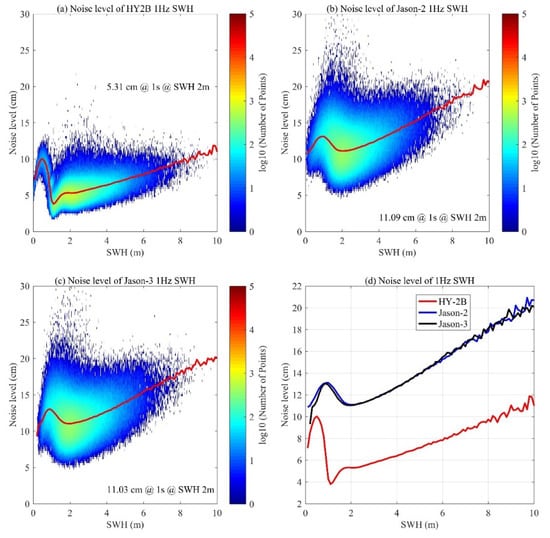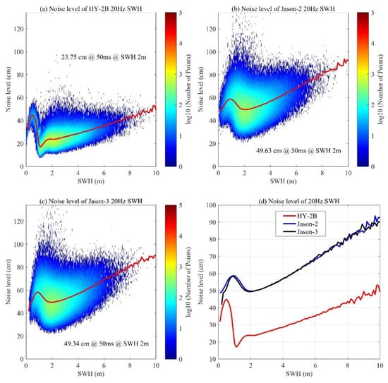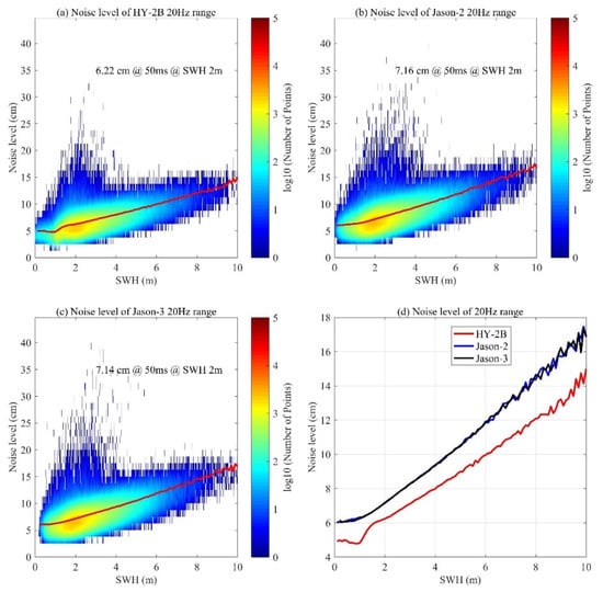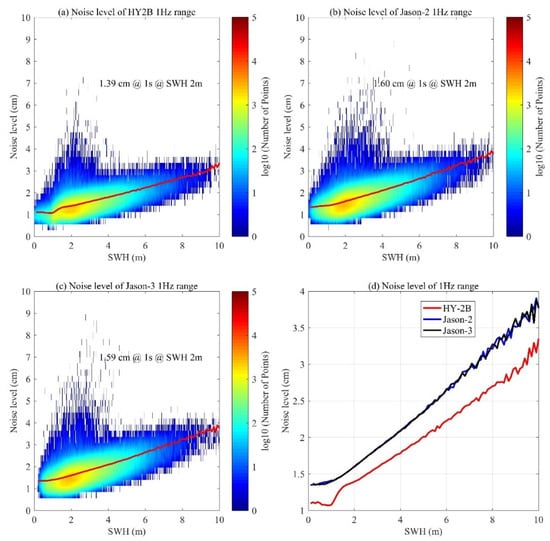 Figure 2 and Figure 3 show the statistical data of the noise levels in the ranges of the 20 Hz and 1 Hz Ku bands, respectively. In the Figure 2 and Figure 3, (a), (b), and (c) represent the scatter diagrams of the noise levels and significant wave heights SWH of the HY-2B, Jason-2, and Jason-3 satellites, respectively. In addition, and the red curves in the Figure 2 and Figure 3 indicate the median of the standard bias calculated according to the significant wave height. For the convenience of comparison, the red curves from Figure 2a–c and Figure 3a–c are displayed in the Figure 2d and Figure 3d. The noise levels of the various ranges had increased with the increases in the significant wave heights SWH, and the noise levels of the ranges obtained by the HY-2B satellite were lower than those obtained by the Jason-2 and Jason-3 satellites in all of the significant wave height ranges. For example, under the conditions of 2 m significant wave heights, the noise levels of the HY-2B altimeter in 20 Hz Ku band range was 6.22 cm. Meanwhile, the Jason-2 and Jason-3 satellites were determined to be 7.16 cm and 7.14 cm, respectively. Furthermore, the noise level of the corresponding HY-2B altimeter in 1 Hz Ku band range was 1.39 cm, while those of the Jason-2 and Jason-3 were 1.60 cm and 1.59 cm, respectively.