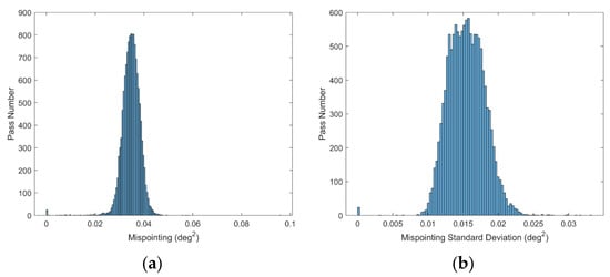 The mispointing angle distributions of the Jason-3 satellite during the period ranging from 31 October 2018 to 5 January 2020 are detailed in Figure 10a, which represent the latest observational data of the Jason-3 satellite which could obtained at the time this study was conducted. The average mispointing angle of one pass was 0.279. Therefore, if this was considered to be valid at less than 0.15 deg2 [18], then the mispointing angles of the Jason-3 satellite could be assumed to be mainly distributed between −0.0075 and 0.025 deg2 after two mispointing angles greater than 0.15 deg2 abnormal pass were deleted. The corresponding standard deviation ranged between 0.017 and 0.118 deg2, as shown in Figure 10b.