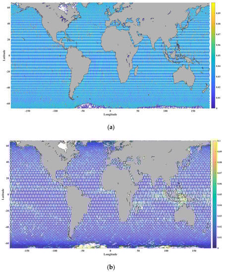 In the present study, in order to analyze the reliability of the HY-2B satellite radar altimeter more clearly, the Jason-3 satellite was selected as a reference. The average mispointing angle of each pass also utilized the same method. Although the orbits of the two satellites were different, and the observation times of each pass had varied, the analysis results of the mispointing angles were not affected by the average times and orbits. Figure 9 shows the comparison of the geographic distribution of the mispointing square between HY-2B and Jason-3. It can be seen from the Figure 9 that the mispointing angle of Jason-3 (Figure 9b) is larger than that of HY-2B (Figure 9a) in mid and low latitude and some nearshore areas. It may be that Jason-3′s orbit control is not as good as HY-2B.