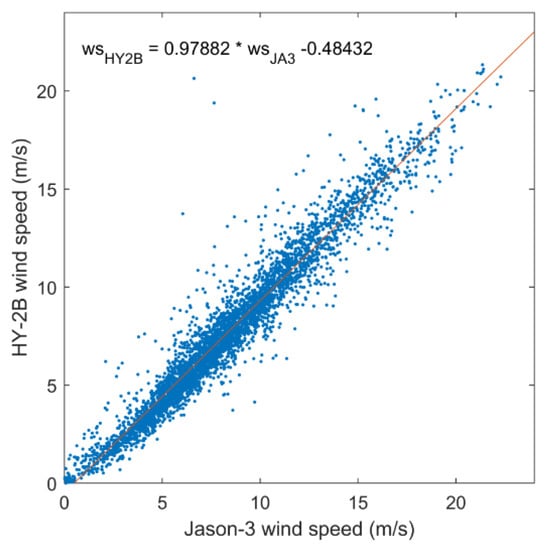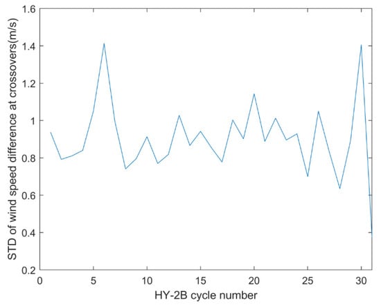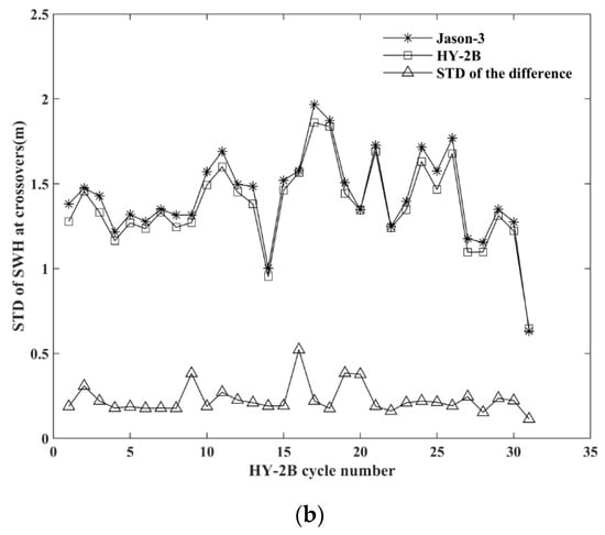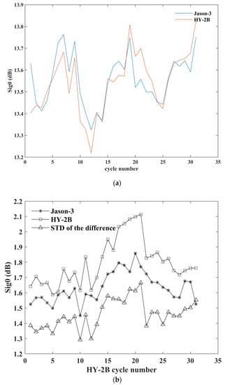 Figure 13a,b show this study’s comparison results of mean and standard deviation of the backscatter coefficients at the crossovers of the HY-2B and Jason-3 satellites, respectively. It can be seen in the figures that both the mean and standard deviations of the backscatter coefficients indicated that the backscatter coefficients observed by the two satellites were very close. However, they also differed, which was similar to the results described in Section 4.
