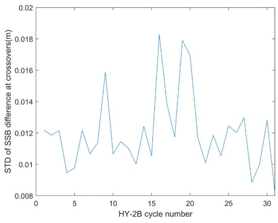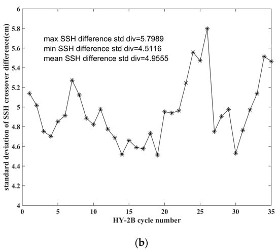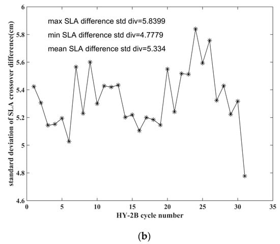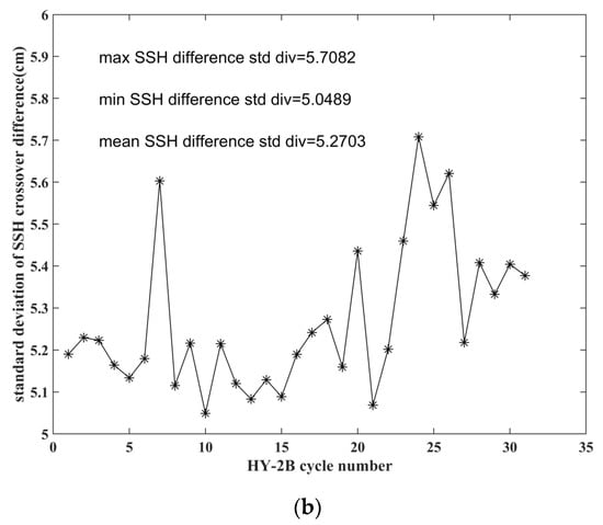 It was found that during the 31 observational cycles, the maximum difference of the mean value of the sea surface height differences at the crossover points was 2.61 cm, as shown in Figure 20a. The differences in the standard deviation of the sea surface heights were found to be minimal, ranging from 5 cm to 5.7 cm, as shown in Figure 20b.