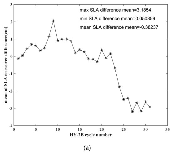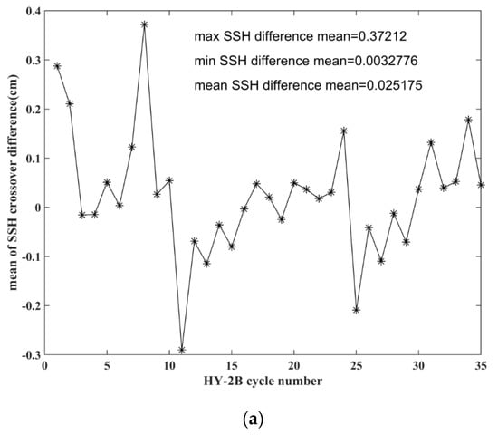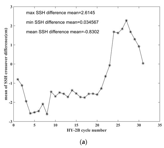 Figure 19a shows the cycle by cycle mean distributions of the differences in the HY-2B sea surface heights at the crossover points of the ascending and descending orbits. It can be seen in the figure that during all 35 cycles, the differences in the average sea surface heights at the crossovers of the ground tracks were less than 4 mm. These results confirmed the observation stability of the HY-2B satellite’s radar altimeter performance. It was also proven that the accuracy of the GDR products of the HY-2B satellite’s radar altimeter had displayed little differences in time and space. There were no time scale bias problems as observed in the HY-2A satellite [3,4,5].