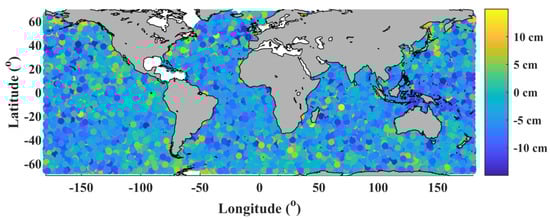 The spatial distributions of the SLA differences at the crossover points of the HY-2B and Jason-3 satellites were very uniform. As shown in Figure 22, there were no significant differences observed between the northern and southern hemispheres resulting from time scale bias. However, in the high-latitude sea areas or near shore shallow water areas, the largest differences observed in the SLA were more than 10 cm.