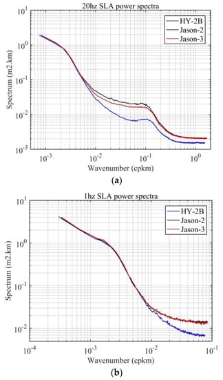 SLA power spectra computed using Jason-2/3 and HY-2B data over the ocean from 30 October 2018 to 27 February 2019. Periodogram power spectral density estimating method was used to compute DFT (discrete Fourier transform) on a logarithmic frequency scale. No zero-padding, rectangular window was used in this process. It was found in this study that there was an interesting feature of a spectral hump, which appeared in the 20 Hz data within the wavelength range between 3 km and 50 km, as shown in Figure 23a. It has been proved that the hump originates in a response to inhomogeneities in backscatter strength through an analysis of simulations and actual data from multiple missions [34]. This spectral hump has been well documented in previous altimetry literature, and reflects one of the main limiting factors of satellite altimetry in regard to resolving small-scale features. As expected, the spectral hump was not visible in the 1 Hz data, as shown in Figure 23b.