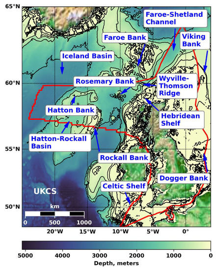 The study was carried out for most of the UKCS, including Dogger Bank in the North Sea, the extension of the UKCS region west of Rockall and parts of the Faroe-Shetland Channel. The continental slope in these areas plays an important role in bringing nutrients to the region and supporting a wide diversity of marine species [16,17]. The outline of the UKCS region used in this study is shown in red in Figure 1, which also shows the bathymetry and seabed topographical features.