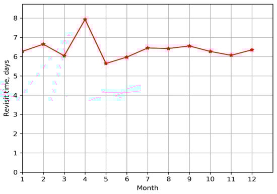 The average revisit time in days for the ENVISAT ASAR sensor within the UK continental shelf as a function of a month. The estimate is based on ENVISAT scenes acquired in 2006–2012.