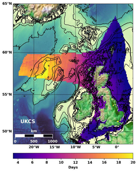 Figure 3 shows the spatial distribution of the revisit time values averaged over the years 2006–2012. It can be seen that sensor data cover the entire UKCS area. The revisit time depends on the location, varying from 20 days in the most distant parts to the west to 3.3 days in the north-east of the North Sea.