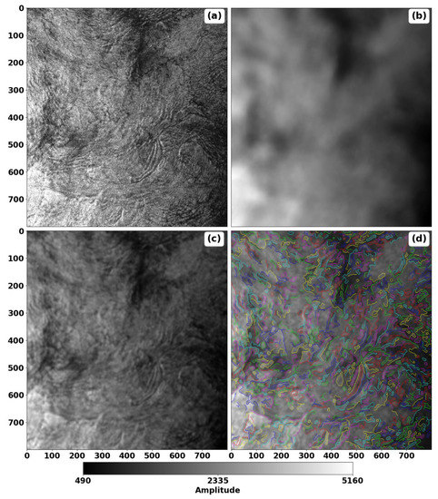 This classic algorithm has been extended with additional stages for the IW edge analysis. At the first stage, the image background intensity level is estimated by applying a running window median filter of round shape and 60 pixels in diameter to the ASAR image, which is shown in Figure 5a. The filter outputs a smoothed image with removed ridge features and details, as illustrated in Figure 5b.