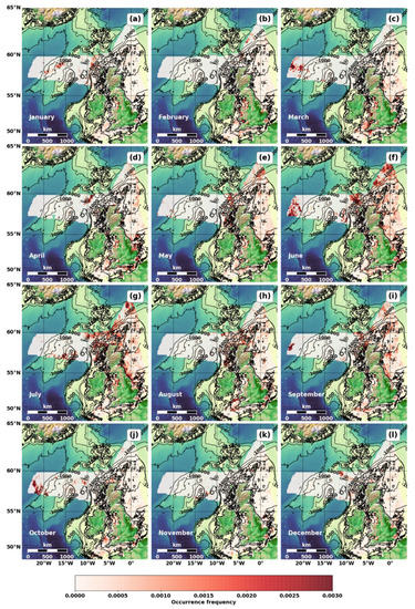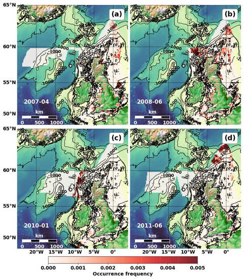 Monthly climatology maps of IW occurrence are presented in Figure 11. The maps were generated by combining the same month over the years 2006 to 2012. These show that a higher intensity of IWs is observed in the spring and summer periods. These observations agree with the seasons when the UKCS waters are more stratified [25].