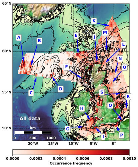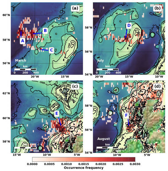 We visually inspected all monthly IW occurrence maps to identify patterns of IW occurrence (see Supplementary Material to access the maps). IW-like features are detected consistently throughout the year very close to the coast, though many of these near-coast detections are likely to be false positives due to the interaction of surface waves with the coastal bathymetry. Further from the coast, we can be more confident in our results. There follows a list of the most prominent non-coastal IW detection features seen in Figure 9, Figure 10 and Figure 11 in the UKCS, from west to east. The features are denoted with letters and their locations are shown in red in Figure 9. Selected features are shown in closeup in Figure 13.