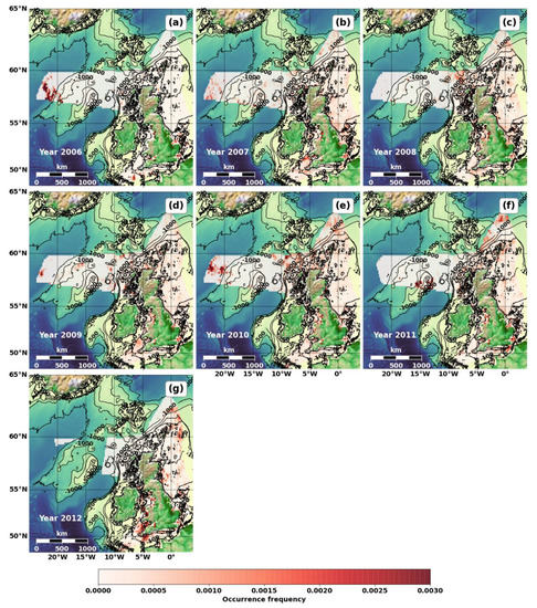 Annual composite maps of IW occurrence are presented in Figure 10 for the years 2006–2012. It is seen from these maps that over the whole year, IWs are mostly present in the Hatton-Rockall Basin and Hatton Bank. The most significant years in terms of IW activity were 2006, 2010 and 2011.