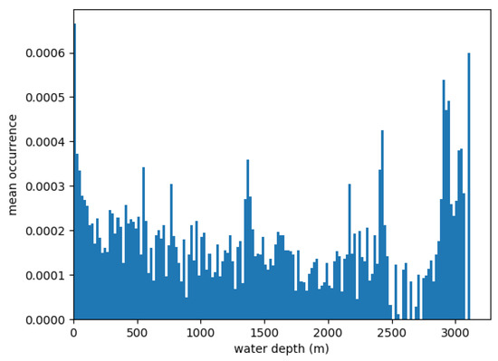 Bar chart of mean internal wave occurrence against water depth. Each bar shows the mean occurrence in a 20 m depth interval.