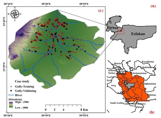 During the last few years, there has been a significant development in the application of machine learning algorithms in natural hazard studies, including floods [6,7,8], wildfire [9], sinkholes [10], drought [11,12], earthquakes [13,14], land subsidence [15,16], groundwater [17,18,19], landslides [20,21,22,23,24,25,26], and gullies [27,28,29,30,31]. Artificial intelligence is considered an advanced technique for predicting gully erosion, as well as managing and reducing the damage caused by this phenomenon. Indeed, Conoscenti et al. [32] assessed the gully erosion susceptibility in Sicily (Italy) using the logistic regression technique. An excellent discriminating ability was confirmed for gully erosion susceptibility with an area under the curve (AUC) greater than 0.8. In another study, Pourghasemi et al. [33] developed an ensemble model of an artificial neural network (ANN) and support vector machine (SVM) for gully erosion susceptibility mapping with promising results (i.e., AUCtrain = 0.897 and AUCtest = 0.879). Finally, the spatial occurrence pattern of gully erosion was properly addressed based on the developed models. Using different machine learning models, Rahmati et al. [34] also predicted and mapped the susceptibility of gully erosion with high performance. The random forest (RF) and RBF-SVM (radial basis function–SVM) models ultimately provided the highest accuracy and stability over other models. A similar study was also implemented for the same purposes based on the Naïve-Bayes tree (NBTree), Logistic Model Tree (LMT), and Alternating Decision Tree (ADTree) models. The findings indicated that the LMT model provided better performance than that of the ADTree and NBTree models. Conoscenti et al. [35] also applied the multivariate adaptive regression splines model to assess gully erosion susceptibility in Italy. Hydrological connectivity was investigated in their study to forecast gully erosion. Similar studies were likewise conducted and presented in [36,37,38,39,40,41,42].