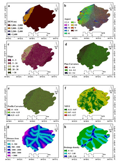 The NDVI is very good for displaying vegetation biomass, leaf area index, crop yield, and vegetation separation and is also used for vegetation related issues [64]. This layer can also be effective in gully erosion modeling [33,65]. The NDVI map was provided using Landsat 8 data from 23/06/2017 (Figure 3f). The value of this factor can be obtained through the following formula: