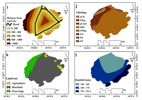 Another factor affecting the gully erosion analysis is lithology [73]. Lithological features are related to geomorphologic features and land surface characteristics [74]. Lithology unit maps were generated using a 1:100,000 scale geological map (GSI, 1997) from the Geological Survey and Mineral Exploration of Iran. The lithological map of the Robat Turk area was divided into eight classes (Figure 3j).