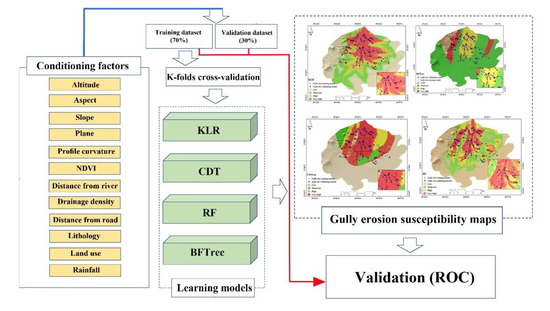 Therefore, we suggest using the RF, KLR, and the CDT models for gully erosion susceptibility mapping in other prone areas to check their reproducibility. The results of this study provide beneficial insights for sustainable development strategies and minimizing destructive hazards to the surrounding environment via gully erosion susceptibility mapping.