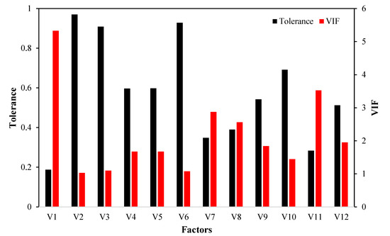 Multicollinearity analysis for the affecting factors: V1: altitude, V2: aspect, V3: slope, V4: plan curvature, V5: profile curvature, V6: NDVI, V7: distance from the river, V8: drainage density, V9: distance from the road, V10: lithology, V11: land use, V12: rainfall.
