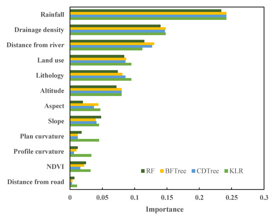 The importance of each gully erosion conditioning factor is another mandatory output used to compute gully erosion susceptibility. The importance values for the 12 conditioning factors were thus considered for gully erosion susceptibility mapping. These values were automatically produced during the model training procedure of the different algorithms (Figure 6). For the KLR model, rainfall was the most important (0.242), followed by drainage density (0.148), distance from the river (0.112), lithology (0.095), and land use (0.095). For CDTree, the most important factor was also rainfall (0.242), followed by drainage density (0.147), distance from the river (0.127), land use (0.086), and lithology (0.086). The results provided by the BFTree algorithm showed that rainfall was again the most important factor (0.242), followed by drainage density (0.148), distance from the river (0.13), land use (0.087), and lithology (0.081). The RF model also indicated that rainfall was the most important gully erosion factor (0.234), followed by drainage density (0.14), distance from river (0.115), land use (0.084), and lithology (0.074). The results showed that the rainfall layer was the most important among the applied layers. Drainage density and distance from the river layers were also subsequently determined.