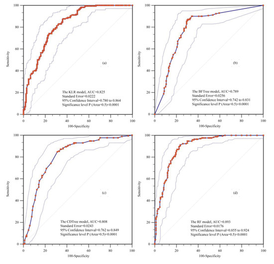 ROC curves using the validation dataset for the (a) KLR, (b) BFTree, (c) CDTree, and (d) RF models.