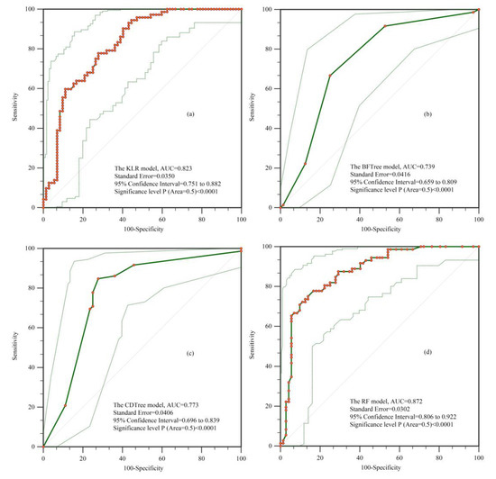 The performance of the models was evaluated using the statistical measures for both the training and validating datasets. In terms of sensitivity, after using the training datasets, the best model was shown to be the RF (0.853) model, followed by the CDTree (0.847), BFTree (0.841), and KLR (0.794) models (Table 1). The specificity result showed that the best model was again RF (0.800), but this time the BFTree (0.706) ranked second, followed by the KLR (0.694) and CDTree (0.688) models. In terms of classification accuracy, the best model highlighted by the training dataset was the RF (0.826) model, followed by the BFTree (0.774), CDTree (0.768), and KLR (0.744) models. However, the sensitivity calculated using the validation dataset indicated that RF and CDTree (0.847) were more reliable models than the KLR (0.778) and BFTree (0.667) models. However, the BFTree model had the highest specificity (0.750), followed by the RF, CDTree, and KLR models (0.722). In terms of accuracy, the RF and CDTree models had higher values (0.785) compared to the KLR (0.750) and BFTree (0.708) models.