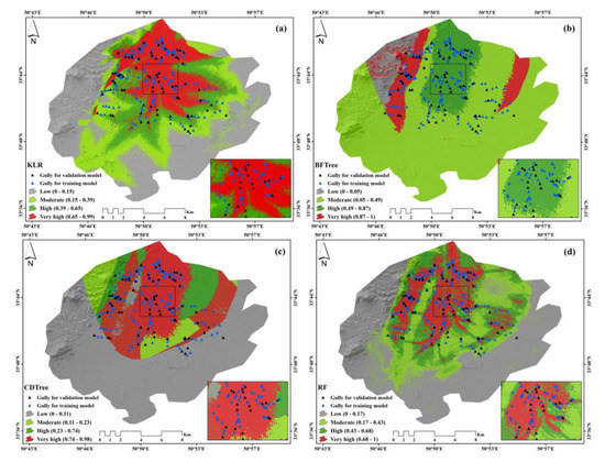 Spatial modeling of Gully erosion produced using the (a) KLR, (b) BFTree, (c) CDTree, and (d) RF models.
