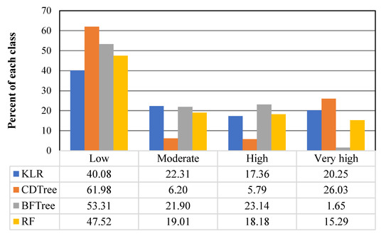 Some classification methods are included in GIS, including natural breaks, quantile, geometric interval, equal interval, and standard deviation. We tested all these models, and the best one was found to be a natural break. The natural break method was thus used to divide the final mapping generated by these models into four categories [23,122]. This method was then used to classify the values of the gully erosion maps because, in this method, classes and classification are determined based on the inherent natural groupings in each group. A break in the class or the threshold of each class indicates that the effects of this group are most similar. On the other hand, these classes will have the greatest differences from each other. Indeed, the classes and tools that are most different from each other are separated and classified in a given situation [123,124]. The application of the KLR model revealed that high and very high susceptibility values were present throughout approximately 37.61% of the Robat Turk watershed (Figure 9a and Figure 10). In total, 61.98% of the research territory was included by the CDTree model in areas with a low gully susceptibility value. In this case, moderate values comprised around 6.20% of the study area, while high and very high susceptibility were spread throughout approximately 31.82% of the study area (Figure 9b and Figure 10). The BFTree model showed that areas with low gully erosion susceptibility were located in 53.31% of the Robat Turk watershed, while those with moderate values spanned over 21.9% (Figure 9c and Figure 10). The results of the RF model revealed that more than 47% of the study area belonged to an area with low susceptibility to gully erosion, while areas with moderate values occupied 19.01% (Figure 9d and Figure 10). Together, areas with high and very high gully erosion susceptibility covered more than 33% of the Robat Turk watershed. By analyzing the results provided by the susceptibility maps of gully erosion derived from the four algorithms, the low susceptibility class was found to occupy the largest area of Robat Turk.