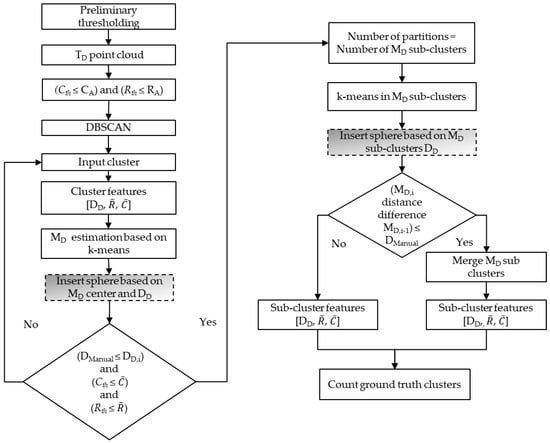 The fact that more than one apple developed per inflorescence led to close appearance of 2–3 fruits in the cloud, resulting in the creation of augmented clusters with more than one apple. Thus, the clusters of 3D points within the sphere were evaluated and partitioned based on their extracted features, creating sub-clusters and defining the number of MD. Therefore, the partitioning was performed for each cluster only on the condition that the three variables, DD, , and , were close to mean values of DManual measured at DAFB120 for each ΔW and Rth, Cth. The features of each sub-cluster were iteratively extracted and re-evaluated, while the partitioning was continued until the sub-cluster features stopped, while fulfilling the condition. Subsequently, the spheres were placed based on the MD and the DD of each sub-cluster. Those spheres, showing a calculated distance between the MD centers below the minimum value of DManual in each ΔW, were merged. Therefore, their MD was redefined and their extracted features were recalculated. It should be mentioned that the MD clusters were considered as ground truth labels for the later evaluation of the method in TL.