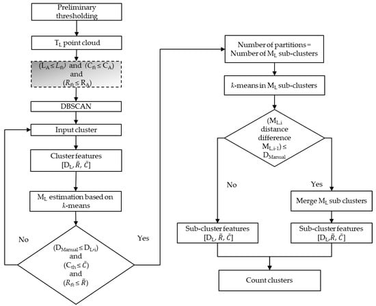 Similarly, the Lth, Cth, Rth were applied to the same trees before their defoliation to segment the apples and find their centers (ML) (Figure 2). The DBSCAN was used to group the segmented points, while the ML centers were defined by the k-means algorithm. Furthermore, the maximum distance in x and y axes was considered as the diameter (DL) of each point set. The main partitioning condition remained the same using the generated features from each cluster. Thus, the features of each TL sub-cluster were iteratively extracted and re-evaluated until fulfilling the conditions. The number of partitions was used in the k-means algorithm to determine the centers of ML sub-clusters. The only difference between analysing TD and TL was the use of the sphere in TD to evaluate the eligibility of the cluster or the need to search for subclusters according to the estimated manually measured fruit diameter.