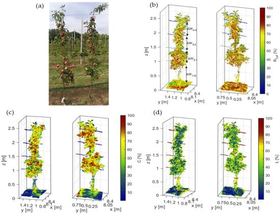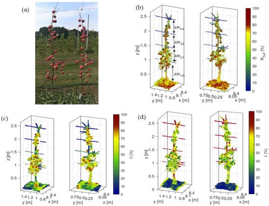 However, the occlusions of leaves and woody parts did not allow the acquisition of the full range of RToF, C, and L values of apples. Therefore, the trees were defoliated and scanned with the LiDAR system at DAFB120 (Figure 4) and data were used to readjust the thresholds. The RW values ranged between 0 and 60%, while the RA appeared from 42 to 90% (Figure 4b). The CA values of apples ranged between 56 and 98%, and the CW appeared between 0.1 and 55.2% (Figure 4c). The 3D points of the latter category revealed the highest values varying between 48.8 and 98.8%. The L values of apple points (LA) were more discretely ranging between 0.2 and 38.3%. (Figure 4d). However, the highest mean value was obtained from the RA class at 71.8%, whereas the mode value (76.1%) was utilized as Rth for the ‘Gala’ trees.