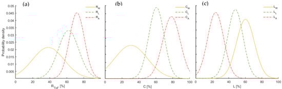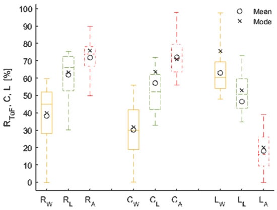 A similar pattern of the probability density of RToF was obtained in C (Figure 5b). The most frequent value within the CA was illustrated at 73.2% (Cth). The values of C of leaves (CL) were partly coinciding with the CA, revealing a mean value at 60.7%, and 9.1% SD. The CW revealed a mean value of 30.1%, with 19.4% SD. The 3D points of LW depicted the highest values (Figure 5c), reaching a mean value of 60.2%, and 94.1% as mode value (Figure 6).