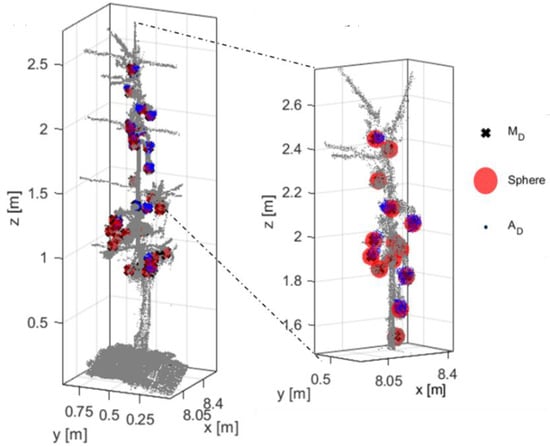 When performing the DBSCAN algorithm, the clusters of filtered points of apples appeared in the 3D point cloud (Figure 7). Subsequently, the k-means partition method was applied to the points of each cluster to acquire the MD. A sphere of variable radius based on the DD of the cluster, enclosed the points of the cluster when placed at MD.