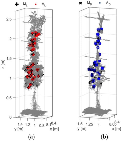 Representation of (a) detected centers in foliated trees (ML) and (b) after defoliation (MD). The red color depicts the apple points of the foliated tree (AL) while the blue color show the points of the fruits in the defoliated tree (AD).