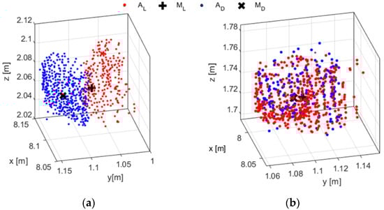 Representation of the (a) worst- and the (b) best-case scenario of the distance of the center of clusters in defoliated (MD) and foliated (ML) trees at DAFB42 and DAFB120. The red color depicts the apple points of the foliated trees (AL) while the blue color the points of the defoliated tree (AD).