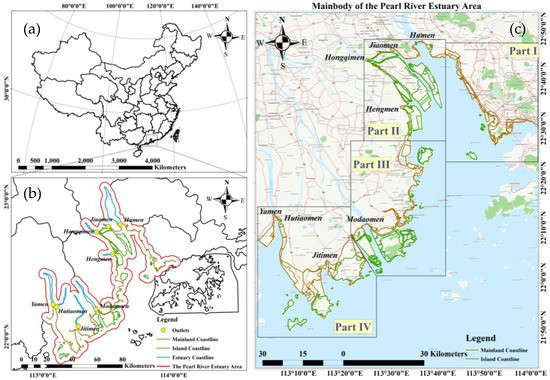 The unique geographic characteristics of the PREA include eight estuaries, namely Humen, Jiaomen, Hongqimen, Hengmen, Modaomen, Jitimen, Hutiaomen, and Yamen (Figure 1). The gross domestic product in this area has soared since 1978 due to the Reform and Opening-up policy [8,36]. More than 8636 reservoirs had been established by the late 1990s [33].