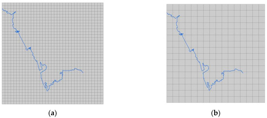 The coastline length would not change when squares of different sizes are applied. Figure 4 shows a number of different square sizes to cover the same coastline, with the left using 1200 m squares and the right using 2700 m squares. The coastline length of (a) and (b) are the same, being 108.28 km; however, the change of grid size led to a different number of grids required.