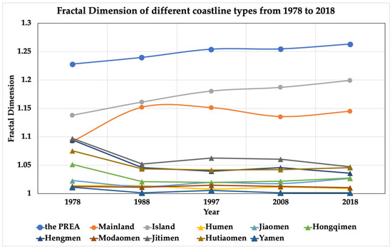 It can be seen from Table 5 and Table 6 that the FD of the PREA has the largest value, from 1.228 in 1978 to 1.263 in 2018 compared with the other three different coastline types of the PREA. The island coastline demonstrated the largest FD compared with the other two types that increased from 1.138 in 1978 to 1.200 in 2018. Some fluctuations could be found on the mainland coastline, where the FD increased from 1.092 in 1978 to 1.152 in 1988, decreased to 1.136 in 2008, and then increased to 1.145 in 2018. It is clear that the FD of estuaries was the smallest among the three different coastline types, decreasing slightly during the period, with the exception of Jiaomen.