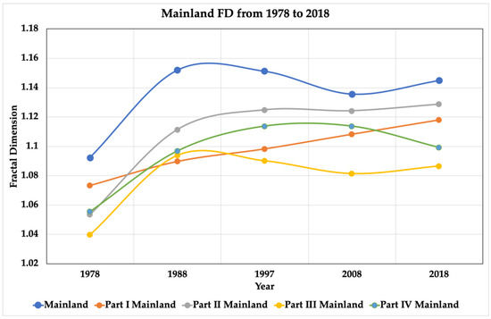 When combined with Figure 12, it is clear that the mainland and the island indicated a better relationship between coastline length and FD because the coastline length and the FD of the mainland and the island show almost the same trend as in Figure 10. The coastline length and complexity were impacted by land reclamation. A more regular artificial coastline was created during the study period, and the mainland and island coastlines were more significantly affected by anthropogenic factors. For these reasons, a positive relationship occurred between the length and FD of the mainland coastline, island coastline, and the majority of the Parts I–IV coastline.