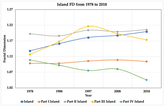 Figure 7 shows that different parts demonstrated different characteristics of FD. Part II obtained approximately the same trend as the PREA, but different from the mainland, the island of Part II had a larger FD value than the PREA, even though the value of the two was nearly the same in 2018. Part III had an increase in FD with significant fluctuations, reaching 1.217 in 1997, which was the largest value in this year. Part I increased slightly from 1.099 in 1978 to 1.104 in 2018. Part IV was the only part to show a FD decline among these four parts. The FD of Part IV dropped to 1.0457 in 2018, making it the fourth most complex. The complexity of the island coastline among Parts I–IV in 2018 could be described as: Part II > Part III > Part I > Part IV.