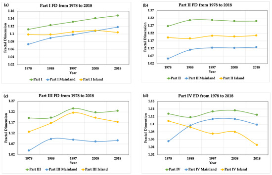 Variations of FD of the four parts in the main body of the PREA from 1978 to 2018. Fractal dimension of total, mainland, and island coastlines of (a) Part I, (b) Part II, (c) Part III, and (d) Part IV.