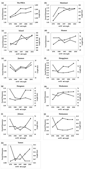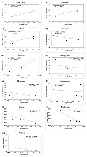 Relationship between coastline length and FD of different coastline types during the study period for (a) the PREA, (b) mainland coastline, (c) island coastline, (d) Humen, (e) Jiaomen, (f) Hongqimen, (g) Hengmen, (h) Modaomen, (i) Jitimen, (j) Hutiaomen, and (k) Yamen.