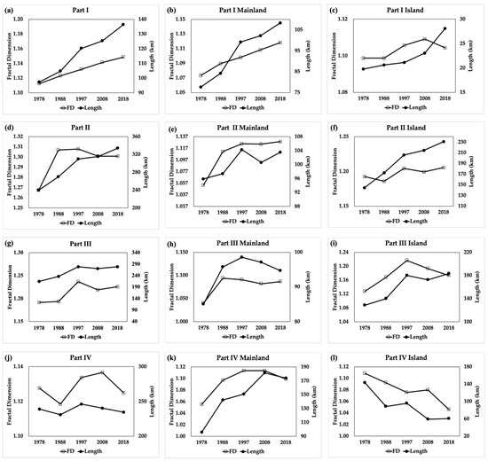 Figure 10 describes the changing trend of coastline length and FD of the different parts of the main body, from Part I–IV. Nearly all the figures (Figure 10a–l) show that the FD of these parts was almost consistent with coastline length. Therefore, for the main body, the increased coastline length represents a more complex coastal boundary and the decreased coastline length represents a less complex coastal boundary.