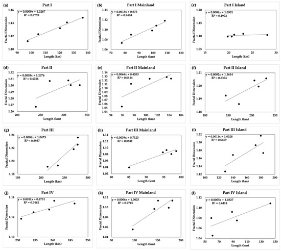 Relationship between coastline length and FD during the study period of Part I–Part IV: (a) Part I, (b) mainland of Part I, (c) island of Part I, (d) Part II, (e) mainland of Part II, (f) island of Part II, (g) Part III, (h) mainland of Part III, (i) island of Part III, (j) Part IV, (k) mainland of Part IV, and (l) island of Part IV.