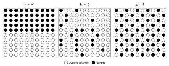 The Normalised Moran’s I Index () takes the value of +1 for clustered samples (left), 0 for random samples (centre) and −1 for spatially-balanced samples (right).