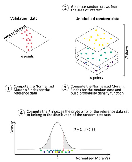 Let us consider a hold-out data set (S) for which the sampling design is unknown. Its spread in the feature space can be measured by the normalised Moran’s I index (). The probability distribution of the normalised Moran’s I index for random samples of the same size as S () can be estimated by drawing random unlabelled samples from the population U and parametric or non-parametric approaches. On average, random samples take the value of zero but dispersion around the mean will depend largely on randomness and the size of S. Based on the empirical probability distribution of values for random samples, the T index is defined as the probability of a randomly-drawn data set to have the same spread in the feature space as the labelled set. This is expressed mathematically as follows,