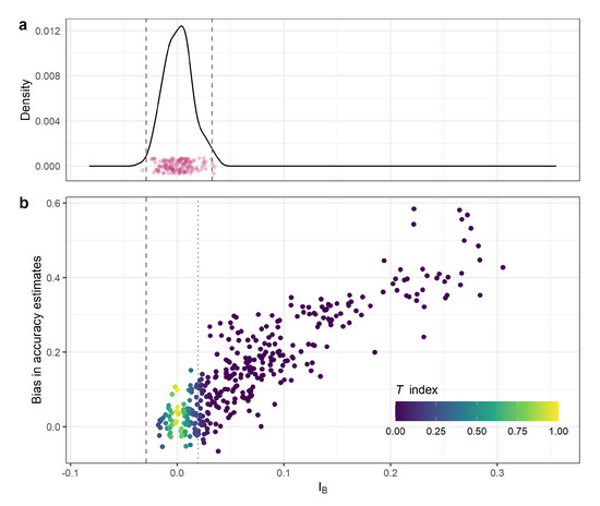 Relationship between Normalised Moran’s I Index () and map accuracy. (a) Empirical distribution of values for random unlabelled data sets. (b) Relationship between the of the labelled sets, their bias and corresponding T index. There is a strong linear relationship between and bias (; ). The dashed line indicates values for which the T index is 0.05.